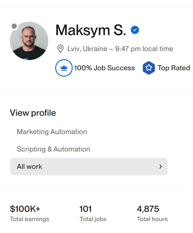 Тож я завів профіль на Upwork (див. зображення) і почав розвиватися як автоматизатор.