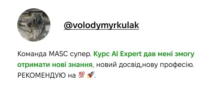 Я давно хотів перейти на міжнародний фріланс у зв'язку з нестабільністю роботи в Україні і просіданням гривні. Думав, що АІ - це занадто складно, але мій перший Західний клієнт за $1200 розвіяв мої сумніви. Дякую MASC!